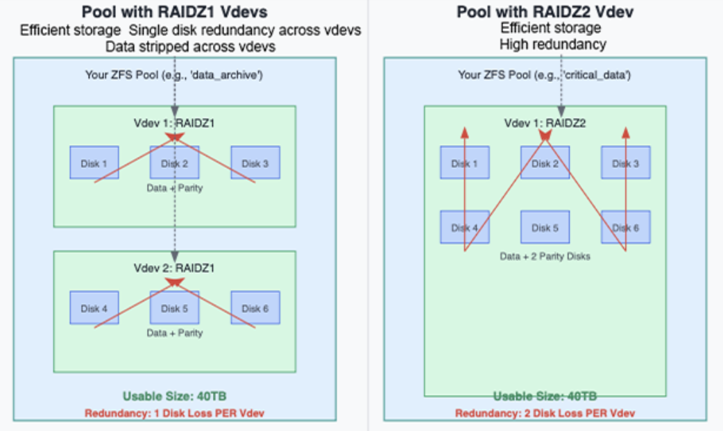 • La redondance des vdevs est locale : La redondance dans ZFS est locale à chaque vdev et non partagée à travers le pool. Assurez-vous de planifier la disposition de vos vdevs pour atteindre le niveau de résilience dont vous avez besoin.